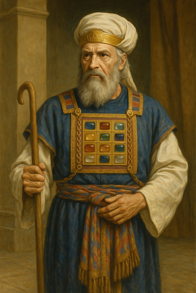 Aaron, le frère de Moïse, fut nommé Grand Prêtre et ses quatre fils étaient ses assistants. Aaron, désormais chargé des fautes commises par les israélites, devait porter les vêtements sacrés suivants : un pectoral et un ephod, sur lesquels étaient gravés les noms des douze tribus d’Israël, une tunique brodée, une tiare, une écharpe. Sur le diadème sacré d’Aaron était inscrit « Sainteté à l’Éternel ». Les couleurs prédominantes étaient le bleu, le pourpre et le cramoisi. Le pectoral et l’ephod étaient garnis de pierres précieuses. La consécration des prêtres se faisait par le sacrifice d’un taureau et d’un bélier devant la tente de la rencontre ; leur sang devait être aspergé autour de l’autel et appliqué sur certaines parties du corps d’Aaron et de ses fils, du côté droit (oreille, pouce, gros orteil). Sept jours étaient nécessaires pour établir les prêtres dans leur fonction, pendant lesquels un taureau par jour était sacrifié et brûlé ; une offrande de deux agneaux d’un an était aussi réclamée par Dieu. Ces offrandes étaient qualifiées de « sacrifice au feu dont l’odeur est agréable à l’Éternel ». Aaron et ses fils furent consacrés par onction sur la demande de l’Éternel, ce qui leur assura l’exercice de la fonction de prêtre à perpétuité pour les générations futures.