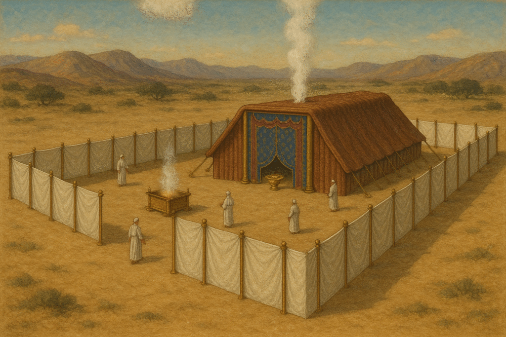 • Dieu fit part de ses exigences pour la construction du tabernacle, qui était le sanctuaire itinérant du peuple hébreu avant la construction du Temple de Salomon, qui sera édifié beaucoup plus tard. Les offrandes destinées à la construction du tabernacle et des objets de culte devaient être composées des matières/ objets suivants : de l’or, de l’argent, du bronze, des étoffes teintes en bleu, en pourpre, en cramoisi, du fin lin et du poil de chèvre ; des peaux de béliers teintes en rouge, des peaux de dauphin, du bois d’acacia, des pierres d’onyx et d’autres pierre pour les vêtements du prêtre. Ce tabernacle représentait le lieu de culte mobile qui permettait à Dieu d’être constamment présent au milieu de la population des israélites.