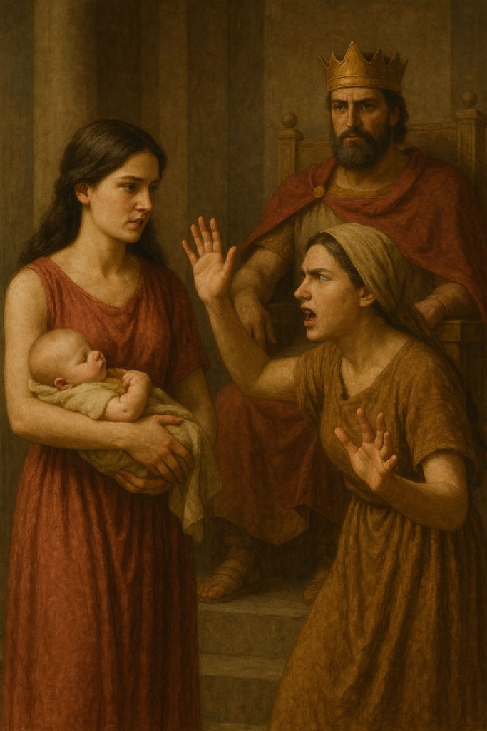 Un jour, deux femmes prostituées vinrent trouver Salomon ; elles avaient accouché d’un nouveau-né à quelques jours d’intervalle, dans la même maison. L’enfant de l’une d’entre elle était mort pendant la nuit et l’une accusait l’autre d’avoir échangé les enfants pour pouvoir s’attribuer la maternité du bébé en vie. Aucun témoin n’avait assisté à la scène, il était donc impossible de savoir qui disait la vérité. Pour révéler la vraie mère, Salomon ordonna : « Coupez l’enfant vivant en deux et donnez-en une moitié à chacune ». La vraie mère, bouleversée, préféra renoncer à son enfant pour qu’il vive. L’autre femme accepta la proposition de Salomon. Salomon comprit alors immédiatement et déclara que la mère qui avait voulu sauver l’enfant était la vraie mère et il lui rendit le bébé.