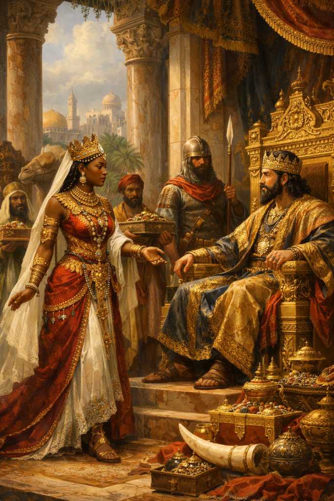 Salomon venait de construire le Temple de Jérusalem et de consolider son royaume. Sa sagesse et sa richesse étaient devenus célèbres dans tout le Proche-Orient. La reine de Saba, souveraine d’un royaume lointain (souvent identifié à l’actuel Yémen ou à l’Éthiopie), entendit parler de sa renommée et décida de lui rendre visite. Elle arriva à Jérusalem avec sa suite, apportant des présents précieux : or, épices et pierres précieuses. Son objectif était de tester Salomon par des énigmes et des questions difficiles, afin de vérifier si sa sagesse était réelle. Comme la Bible le souligne : « Elle est venue éprouver Salomon par des énigmes ». Elle fut très impressionnée par la sagesse exceptionnelle de Salomon et par sa prospérité.  Elle loua le Dieu d’Israël pour avoir placé Salomon sur le trône ; elle offrit des cadeaux précieux et reçut des présents en retour.