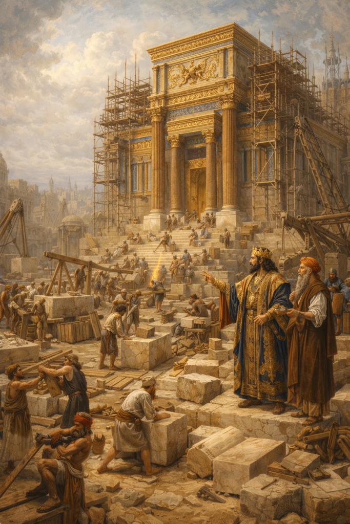 Salomon dominait sur un vaste territoire, qui s’étendait jusqu’aux frontières de l’Égypte. Ces pays payaient un tribut à Salomon et ils lui furent asservis pendant la durée de son règne. Salomon était réputé pour son intelligence, ses connaissances et sa sagesse et il était très respecté et écouté par les nations environnantes. Salomon prononça 3000 sentences et composa 1005 cantiques. Lorsqu’il entreprit la construction du Temple, il fit appel à Hiram Ier, le roi de Tyr, qui avait toujours apprécié son père David. Hiram envoya à Salomon des cèdres et des cyprès par l’intermédiaire de ses serviteurs et Salomon fit parvenir à Hiram du blé et de l’huile d’olive vierge. Plusieurs dizaines de milliers d’homme furent assignés à la construction du Temple, notamment pour porter les fardeaux et tailler les pierres.