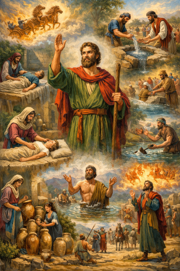 Le règne de Joram fut surtout marqué par les actions du prophète Élisée. Parmi les épisodes célèbres : la multiplication de l’huile de la veuve, la résurrection du fils de la Sunamite, la guérison du général Naaman, la délivrance d’Israël contre les armées d’Aram. Ces récits montraient que la véritable autorité spirituelle appartenait au prophète plutôt qu’au roi.