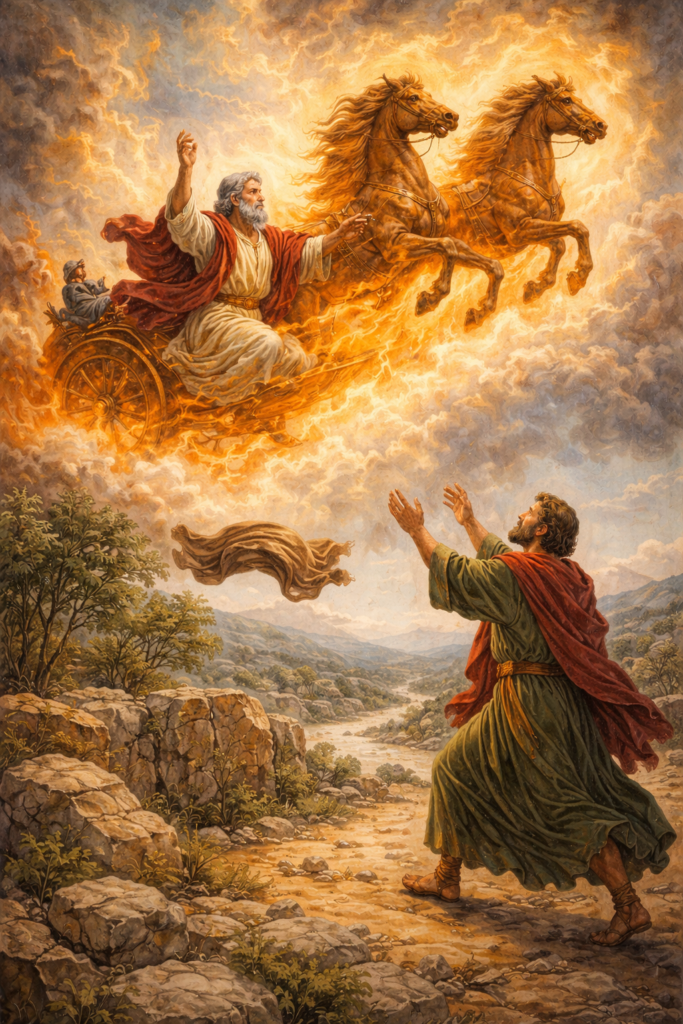 Soudain, un événement spectaculaire se produisit : un char de feu et des chevaux de feu apparurent et séparèrent les deux prophètes, puis, Élie fut emporté au ciel dans un tourbillon. Élisée cria alors : « Mon père ! Mon père ! Char d’Israël et sa cavalerie ! ». Élie disparut et Élisée ne le vit plus. Après l’enlèvement, un objet resta : le manteau d’Élie tomba au sol. Élisée le ramassa. Il retourna vers le Jourdain, frappa l’eau avec le manteau et dit : « Où est le Seigneur, le dieu d’Élie ? ». L’eau se sépara de nouveau. Ce miracle confirma que l’esprit d’Élie reposait maintenant sur Élisée.