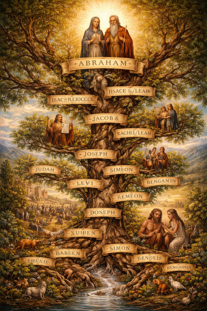 Les fils d’Isaac sont Ésaü et Jacob et c’est Jacob (Israël) qui devient le père des 12 tribus.