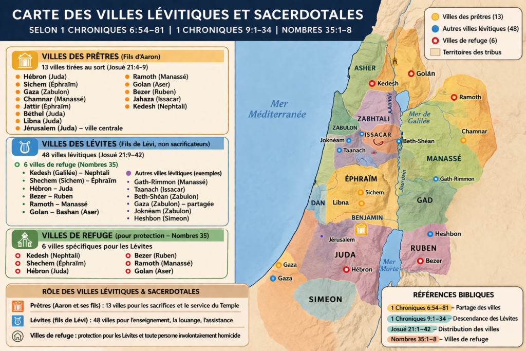 Dans 1 Chroniques se trouve une description détaillée des villes attribuées aux Lévites et aux prêtres après la conquête de Canaan. Ces villes avaient à la fois un rôle d’habitat et un rôle rituel, car les Lévites n’avaient pas de territoire propre comme les autres tribus.