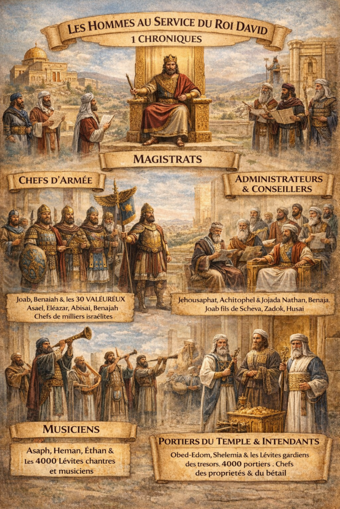 L’organisation du service du culte dans 1 Chroniques est une étape majeure du règne de David. Elle montre comment il structure de manière précise et harmonieuse tout ce qui concerne le service du tabernacle et, par anticipation, du future Temple. Même si le Temple sera construit plus tard par Salomon, David organise déjà les fonctions religieuses : il répartit les responsabilités et établit un ordre durable.