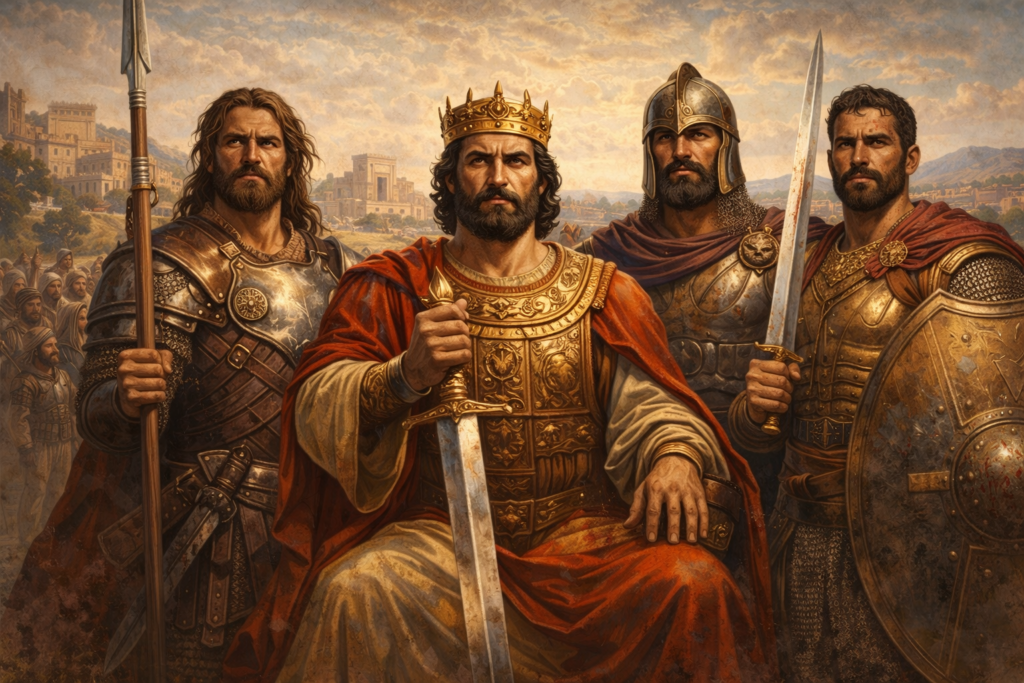 Les « vaillants hommes » de David étaient une élite de guerriers qui entouraient et soutenaient David. Ils incarnaient une force collective au service d’un roi choisi. C’étaient des guerriers d’exception, connus pour leurs exploits, des hommes fidèles et des individus issus de différentes tribus d’Israël. Le texte insiste sur leur courage, leur loyauté et leur détermination intérieure. Les rois héros principaux se nommaient Jashobeam, Éléazar et Shamma, qui représentaient des actes de bravoure presque mythiques. Au-delà des « Trois », il existait un groupe appelé les « Trente » (une élite élargie) ; parmi ces hommes, Abishaï et Benaja étaient connus pour avoir été de grands combattants.