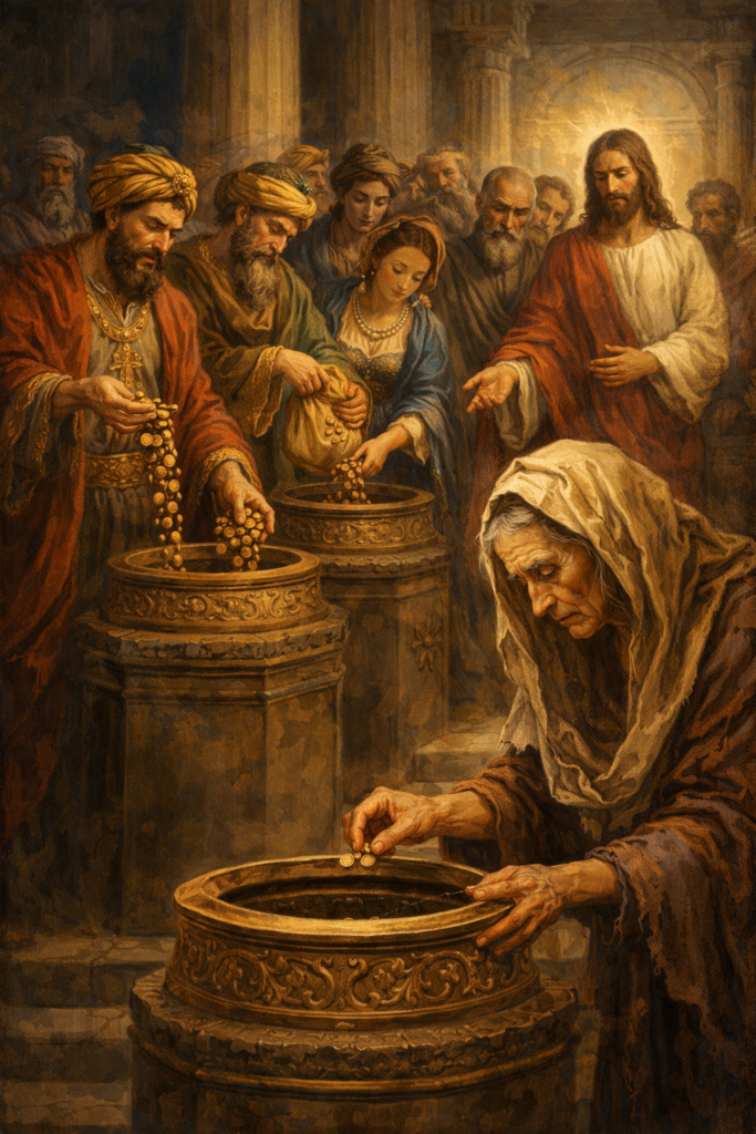 Jésus était au Temple, observant les gens qui déposaient leurs offrandes dans le trésor. Il constata que les riches donnaient de leur superflu alors qu’une pauvre veuve, en donnant deux petites pièces, avait donné ce qu’elle avait pour vivre. En fait, par ce geste, Jésus ne regarde pas la somme d’argent qui est offerte, mais la piété intérieure, l’offrande qui est faite avec le cœur, par pour les apparences. Si objectivement, la veuve ne donne qu’une somme très modeste, spirituellement, elle donne tout.