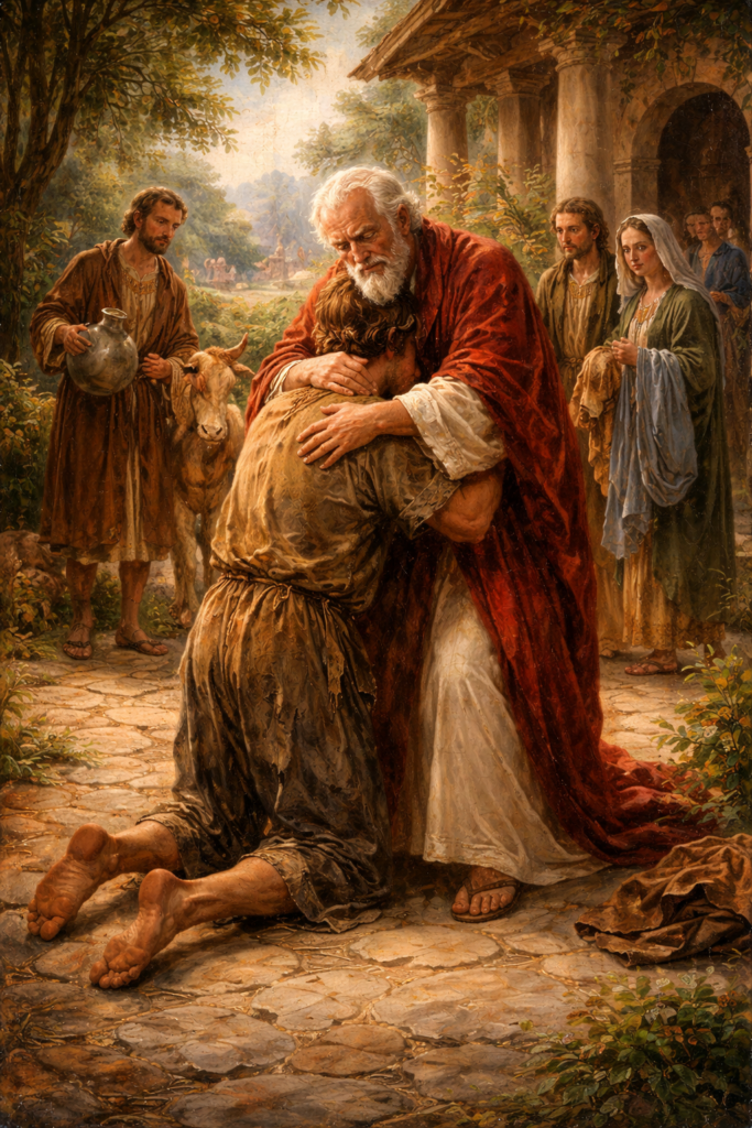 Un père avait deux fils. Le plus jeune lui demanda un jour sa part d’héritage pour partir mener la grande vie. Il partit loin, dilapida tout et finit affamé, obligé de garder des porcs (le fond de l’impureté pour un juif) pour survivre. Alors, il décida de revenir auprès de son père et prépare un discours de repentance. Lorsque le père le vit arriver au loin, il courut à sa rencontre et l’embrassa ; il rendit au fils la robe (la dignité), l’anneau (l’appartenance) et les sandales (la liberté).