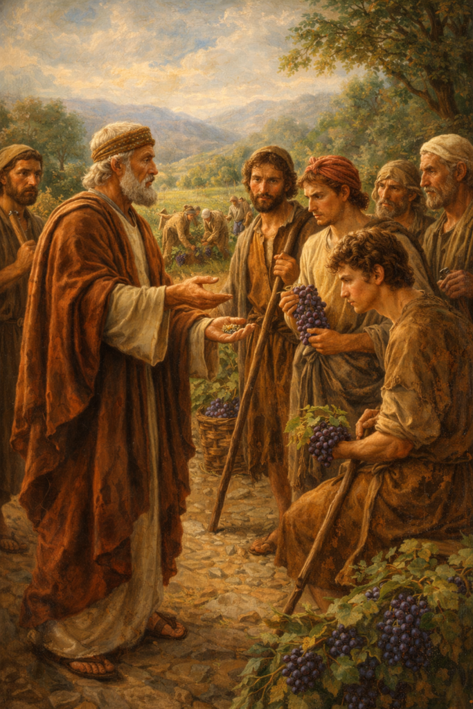 Un homme planta une vigne, la loua à des vignerons, et partit dans un autre pays. À la saison des fruits, il envoya un serviteur pour en recevoir sa part. Les vignerons le battirent et le renvoyèrent les mains vides. Le maître envoya plusieurs serviteurs, mais ils furent maltraités, tués ou chassés. Enfin, il envoya son fils, pensant qu’il serait respecté ; mais les vignerons tuèrent aussi le fils.