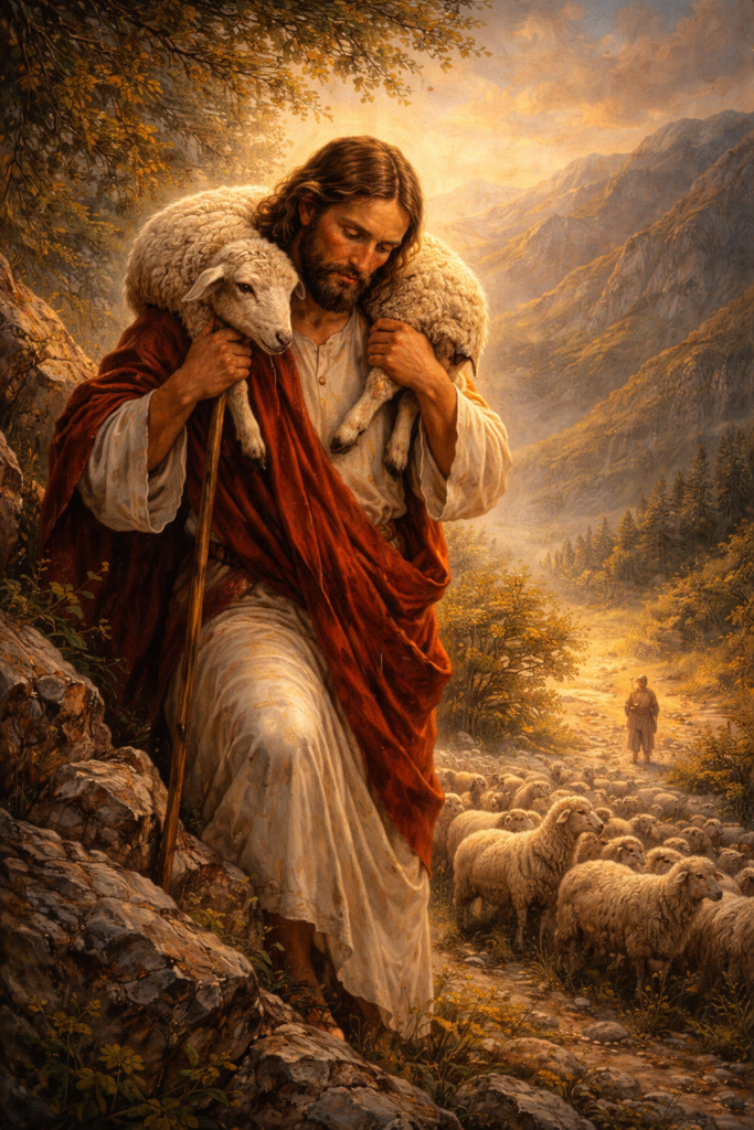 Un berger a cent brebis. Il en perd une. Jésus dit : « Il laisse les quatre-vingt-dix-neuf dans le désert pour aller chercher celle qui est perdue ».