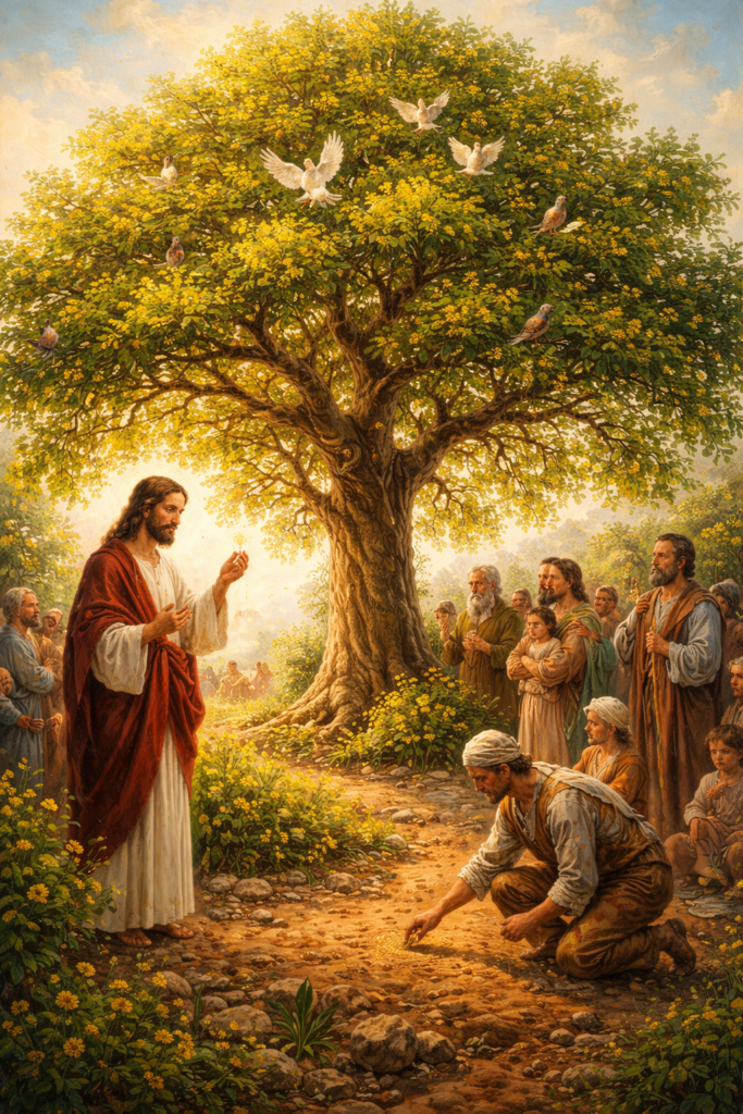 Pour décrire le royaume de Dieu, Jésus dit qu’il est semblable à une graine de moutarde qu’un homme a prise et jetée dans son jardin ; elle a poussé, est devenue un arbre, et les oiseux du ciel ont fait leur nid dans ses branches.
